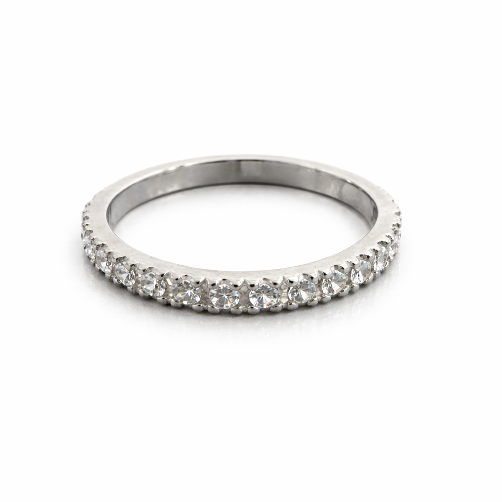 The Back Ring is crafted in solid 18K gold and set with a continuous line of sparkling stones, symbolizing endless elegance and timeless beauty. Its slim profile makes it perfect for stacking or wearing alone as a refined statement.