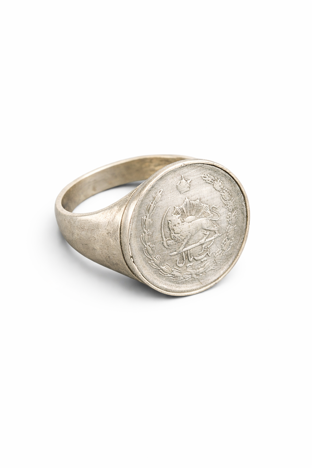 This unique silver signet ring is crafted from an authentic Iranian 1 Rial coin, transformed into a timeless piece of wearable history. Preserving the original engraving of the coin, the ring carries cultural significance while embracing a refined, contemporary form. The naturally aged silver surface highlights the coin’s details and gives the ring a subtle antique character. Designed with a solid, comfortable band, it is made for everyday wear while remaining distinctive and meaningful. A unisex statement piece, ideal for those drawn to jewelry with identity, memory, and historical depth.